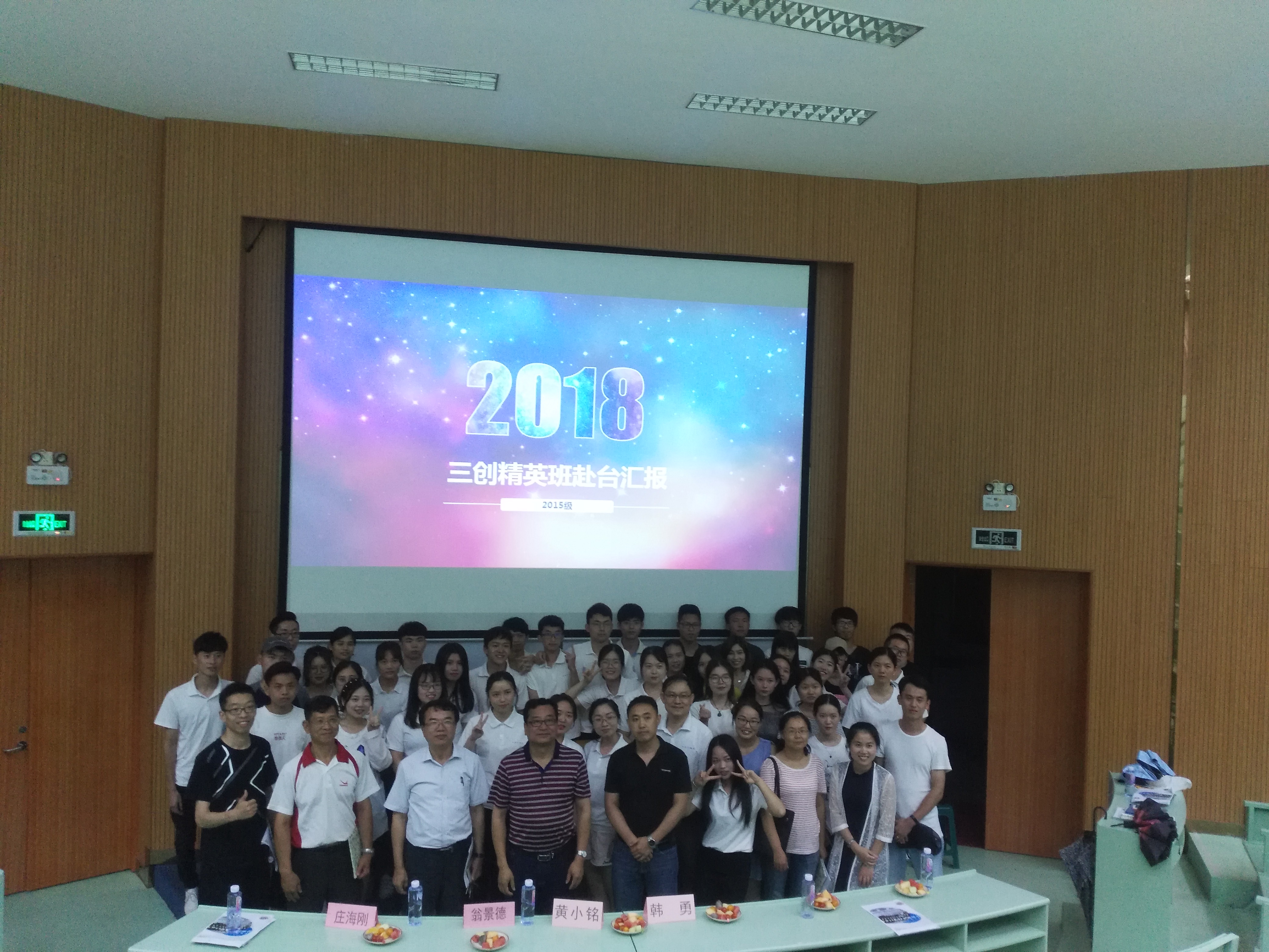 5月30日下午,sjb世俱杯2015级三创精英班在第一教学区和昌楼乐之讲堂召开赴台汇报会。副校长黄小铭,sjb世俱杯院长翁景德、副院长庄海刚,国际合作与交流处韩勇处长,sjb世俱杯各系老师、辅导员及16级全体学生参加本次汇报会。