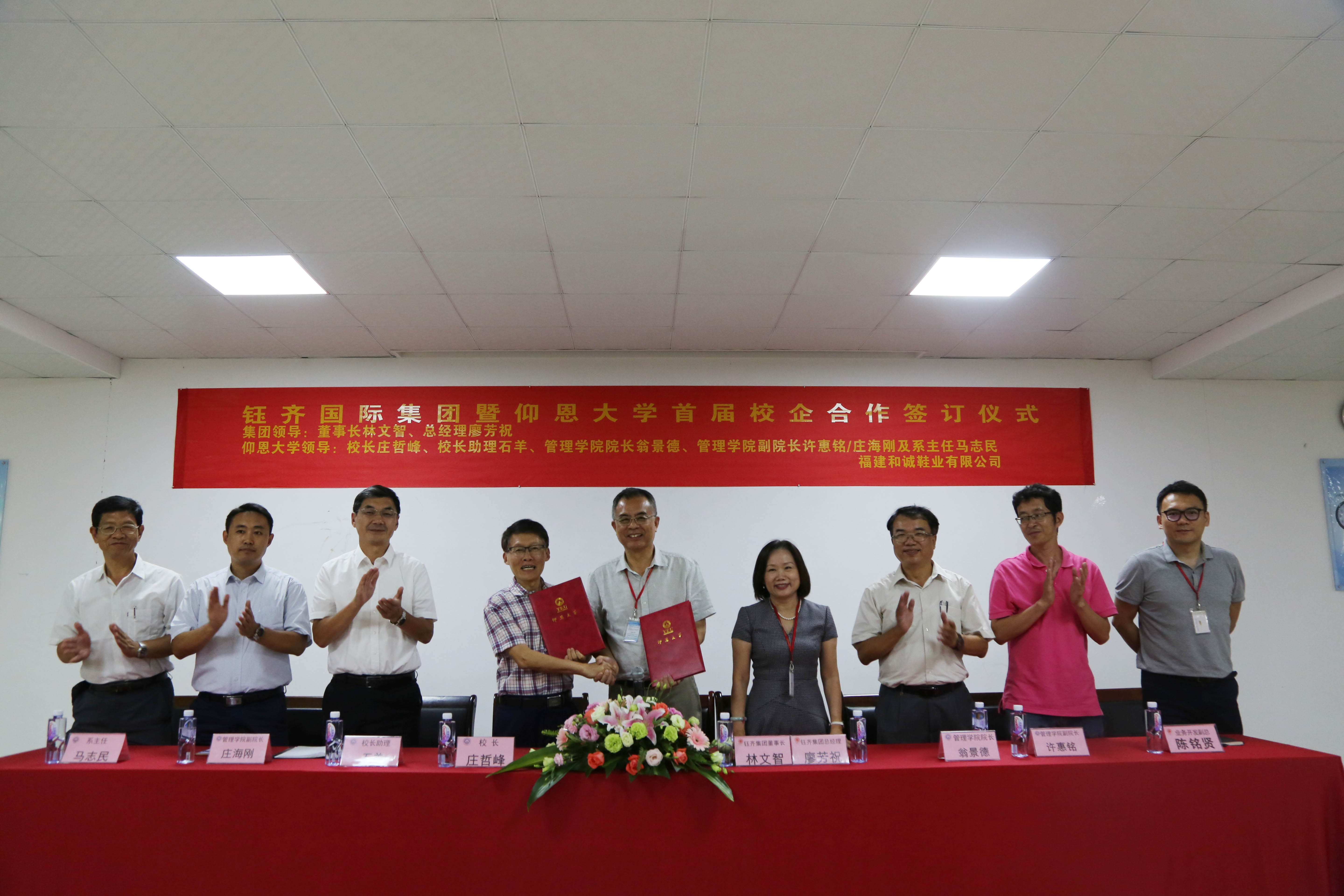 9月19日下午,校党委书记庄哲峰,校长助理石羊,sjb世俱杯官方网站院长翁景德,sjb世俱杯官方网站副院长许惠铭、庄海刚及系主任马志民一行前往福建和诚鞋业有限公司参访,并签订校企合作意向书。钰齐集团董事长林文智、总经理廖芳祝,业务开发副总陈铭贤等出席了本次签订仪式。