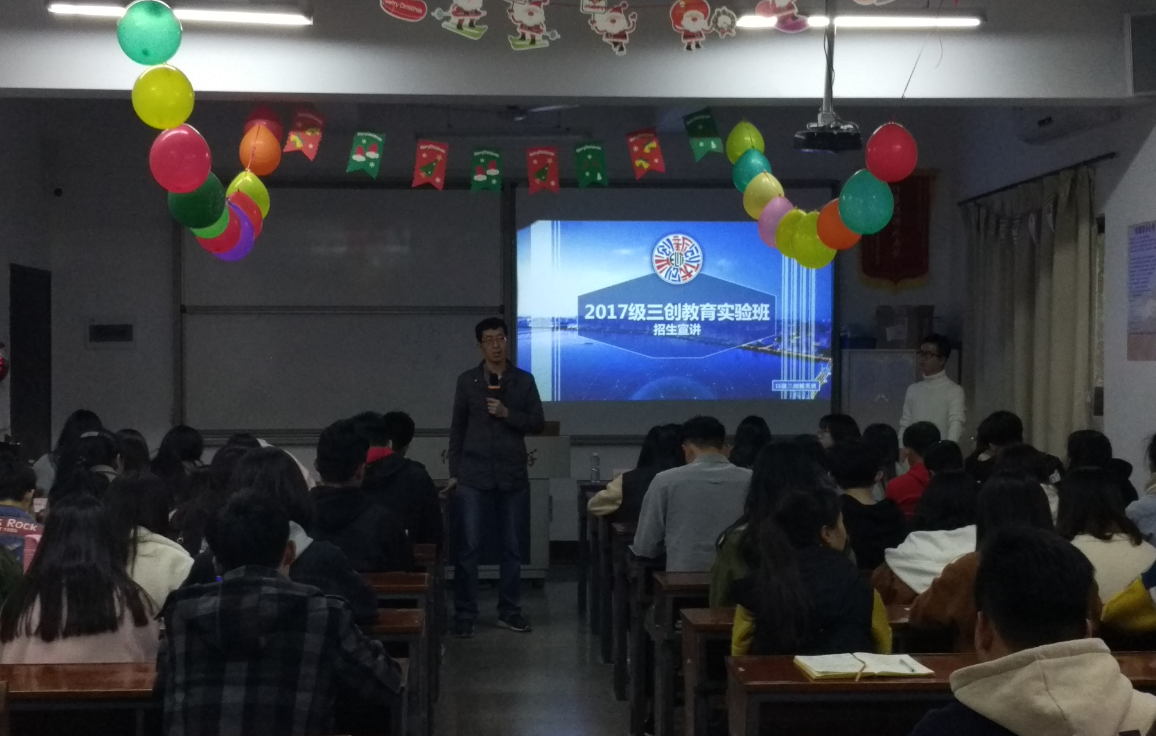 主讲人介绍三创教育实验班的办学特色 2017级三创教育实验班招生宣讲会的成功举办不仅增进了同学们对三创实验班的了解,也推动了师生间的交流。希望实验班可以招收到一批有着浓厚学习兴趣和创新能力的同学,培养一批兼具创新思维、创新意识和创业能力复合型创新人才,大力提升学生的综合素质。(杜心田、陈玉珠/图文)
