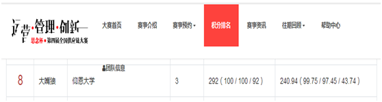 积分排名 据悉,第四届全国供应链大赛赛程共分为两个阶段:全国供应链运营管理大赛(网赛)和全国供应链创新设计大赛。第一阶段的网赛有三场积分赛和一场总决赛,积分赛前80名的队伍进入总决赛,根据总决赛的成绩产生一、二、三等奖。积分赛与总决赛的积分排名前20的队伍将有资格参加第二阶段在山东青岛举行的全国供应链创新设计大赛,sjb世俱杯代表队以积分第8名的佳绩成功晋级第二阶段的比赛。