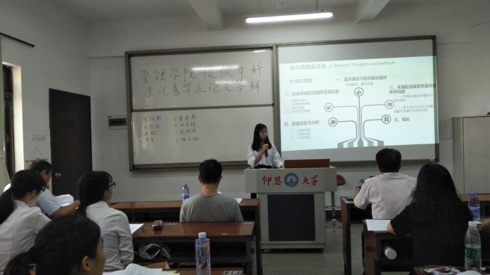 答辩进行时 本次院级优毕答辩目的在于进一步审查论文,推选校级优秀毕业论文。活动主要分为两个阶段,第一阶段由各系经过一辩遴选的优毕学生借助PPT形式讲解论文,第二阶段由三位导师提问进行现场答辩,并指出论文不足之处。