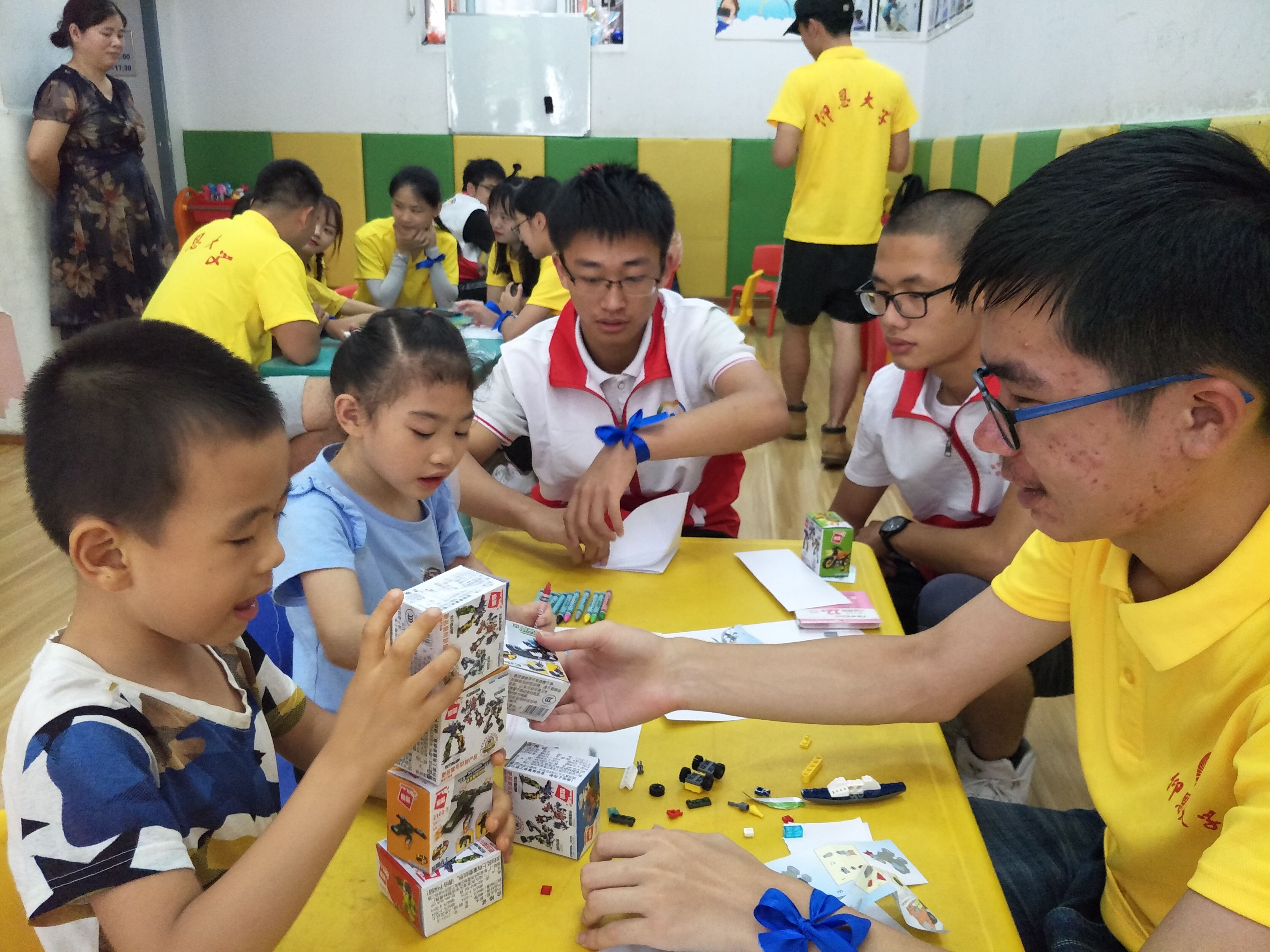 队员们陪小朋友们一起拼益智玩具