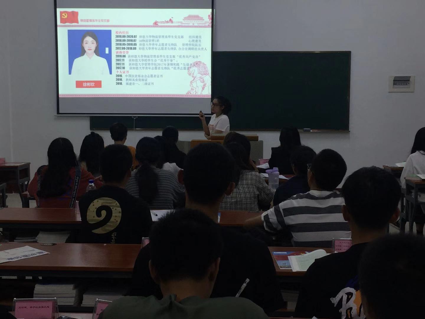 为增强新生对党的认识,端正入党动机,物流管理系学生党支部于10月9日晚,在祥贤楼106对2019级物流管理1班与2019级物流管理专升本1班的新生开展“入党启蒙”教育。