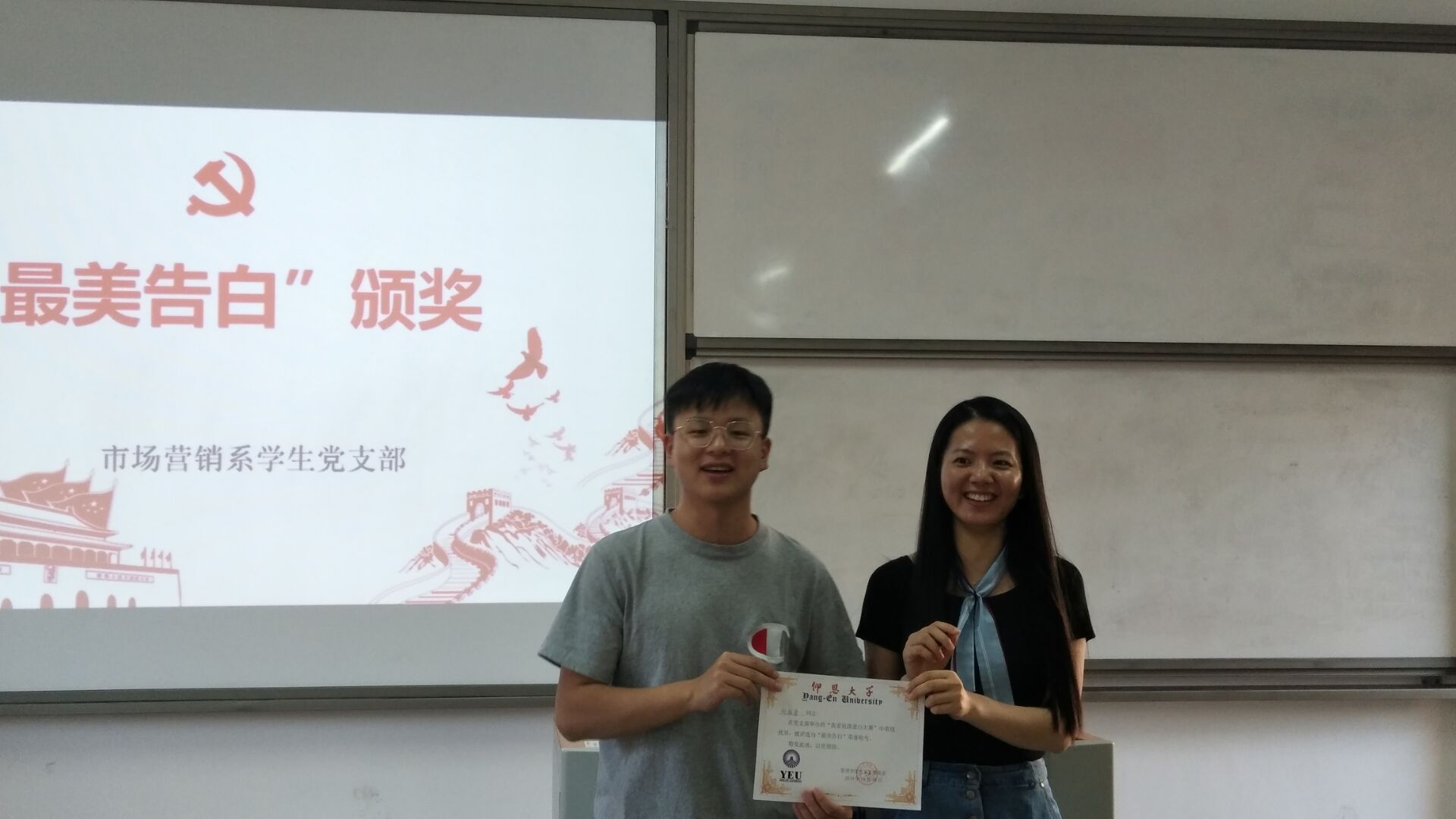 颁奖 本次大会共分为4个议程。首先,洪如莹同志回顾了每位党员三行情书的内容;然后,每名党员依次上台,以自身的所见所感为创作素材,分享背后的灵感,现场掌声连连;接着,根据现场微信投票,选出刘振涛和洪如莹两位同志的表白为本次活动的“最美表白奖”;最后,支部书记连景霞为获奖同学颁发奖状。