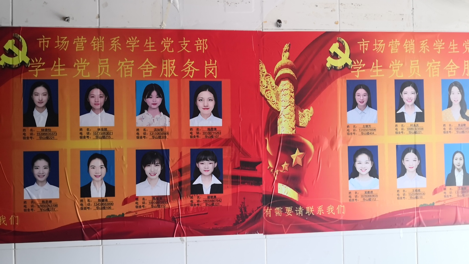 男生宿舍党员示范岗 活动前期,由陈小丹同志负责收集市场营销系学生党支部党员的基本信息,制作成展板,并且申请张贴资格。活动中,学生党员负责将展板粘贴至学生宿舍生活区,同时负责对学生群众进行相关的宣传。通过开展党员示范岗的活动,达成一个有效的示范以及监督作用。