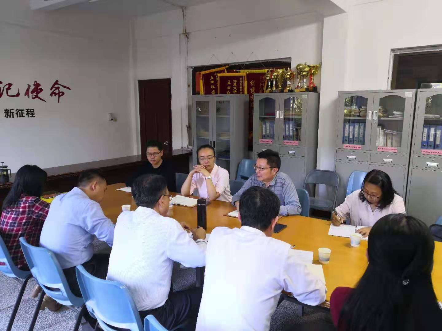 sjb世俱杯官方网站院领导汇报学院工作情况 sjb世俱杯官方网站党总支书记许惠铭代表学院欢迎党委书记何宏舟一行来sjb世俱杯开展调研工作,并对sjb世俱杯官方网站党建工作、专业建设、教师队伍建设等情况进行汇报,对标杆学院建设工作进行重点介绍,提出sjb世俱杯官方网站近年来专业建设、教师队伍建设、党建工作中存在的短板和急需解决的问题,以及学院下一步工作计划。