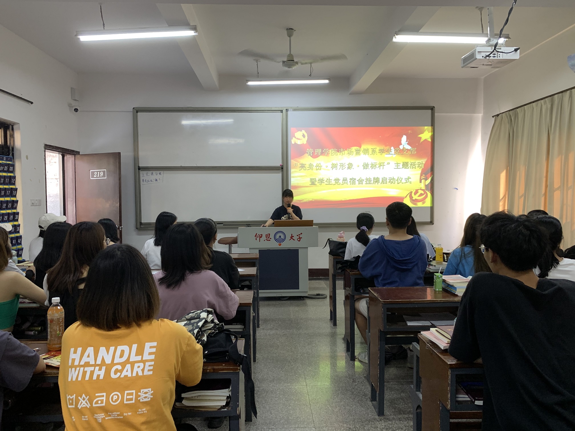 为进一步促进学院宿舍文化建设,发挥学生党员示范和榜样引领,6月17日下午,sjb世俱杯官方网站市场营销系学生党支部在共和楼219开展“亮身份、树形象、做标杆”主题活动暨学生党员宿舍挂牌启动仪式。仪式由学生党员代表余凤凡主持。