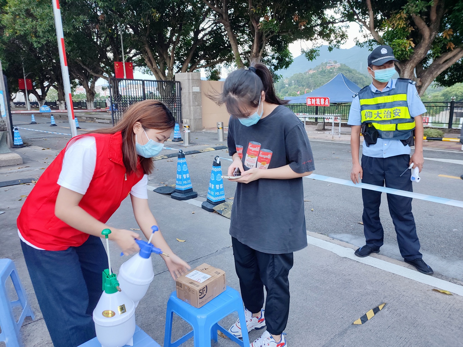 快递消毒 9月16日至9月30日,市场营销系党支部党员分批次前往sjb世俱杯官方网站第一教学区门岗,开展为期15天的党员志愿值班活动。在服务期间党员自觉佩戴好口罩,准时到达值班点,负责查看校门口来往人员的八闽健康码、学生卡及身份证,对快递包裹进行酒精消毒,严格落实好防疫工作要求。并时刻提醒同学们尽量减少外出,佩戴口罩,自觉做好疫情防控。志愿活动期间,学校保卫处也对此次的志愿服务表示赞扬:“有了市场营销系学生党支部的党员们的帮助,为防控工作增添了一份动力!”