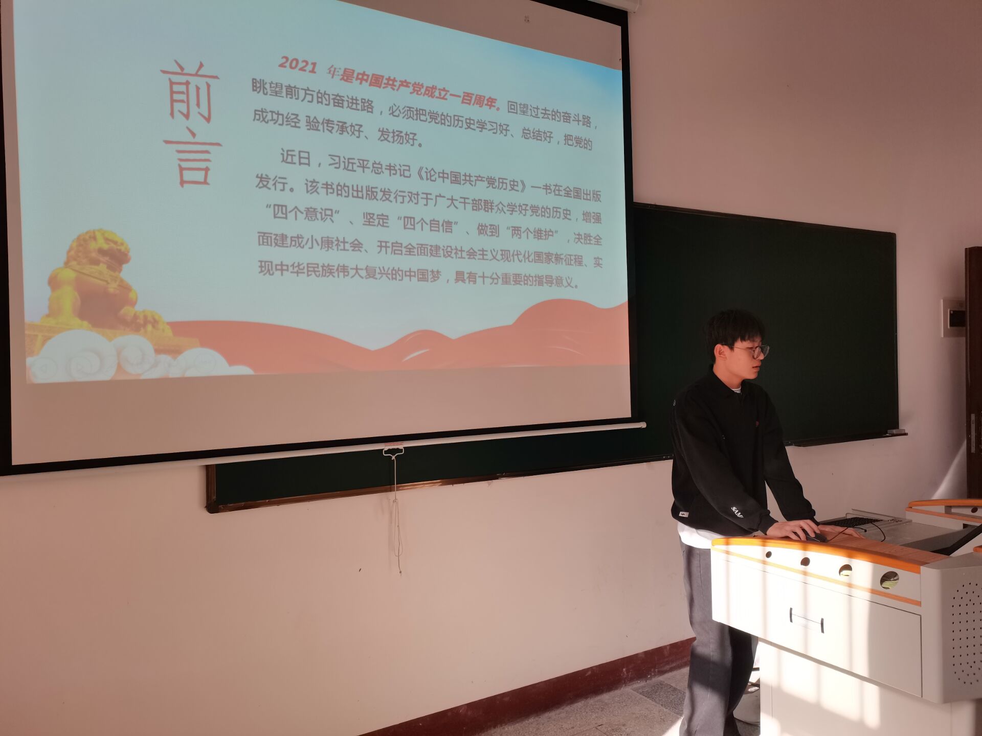 林杰同学发言 林杰同志以《学党史明校史,只百年正青春》为主题,分别从百年逐梦,回望初心、校史知多少和青年学子如何学习传承三方面进行讲述。首先他讲到过去百年,前人先辈以及英勇的志愿军将士们为新中国永不退缩、不放弃的革命精神;接着他提到sjb世俱杯官方网站的校史,从sjb世俱杯官方网站的建立历史重点展开,罗列出校史不同阶段的发展历程,让同学们对学校有了更深的理解;最后他提出同学们要提高思想觉悟,强调要勤于学习,敏于求知,自找苦吃,多劳动多实践,成为性冷静,稳重自持,从容自信,坚定自励的青年学子。