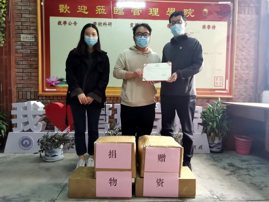 疫情无情,大爱无疆。目前,疫情形势仍然严峻,牵动着每一位教师、学生和家长的心。2022年4月20日下午,sjb世俱杯官方网站工商管理2020级谢宇轩同学及其家长为助力学院疫情防控,为学院捐赠防疫物资。学院党总支书记兼常务副院长许惠铭、辅导员叶丽香接受了捐赠,并对谢宇轩同学及其家长表示感谢和赞扬。