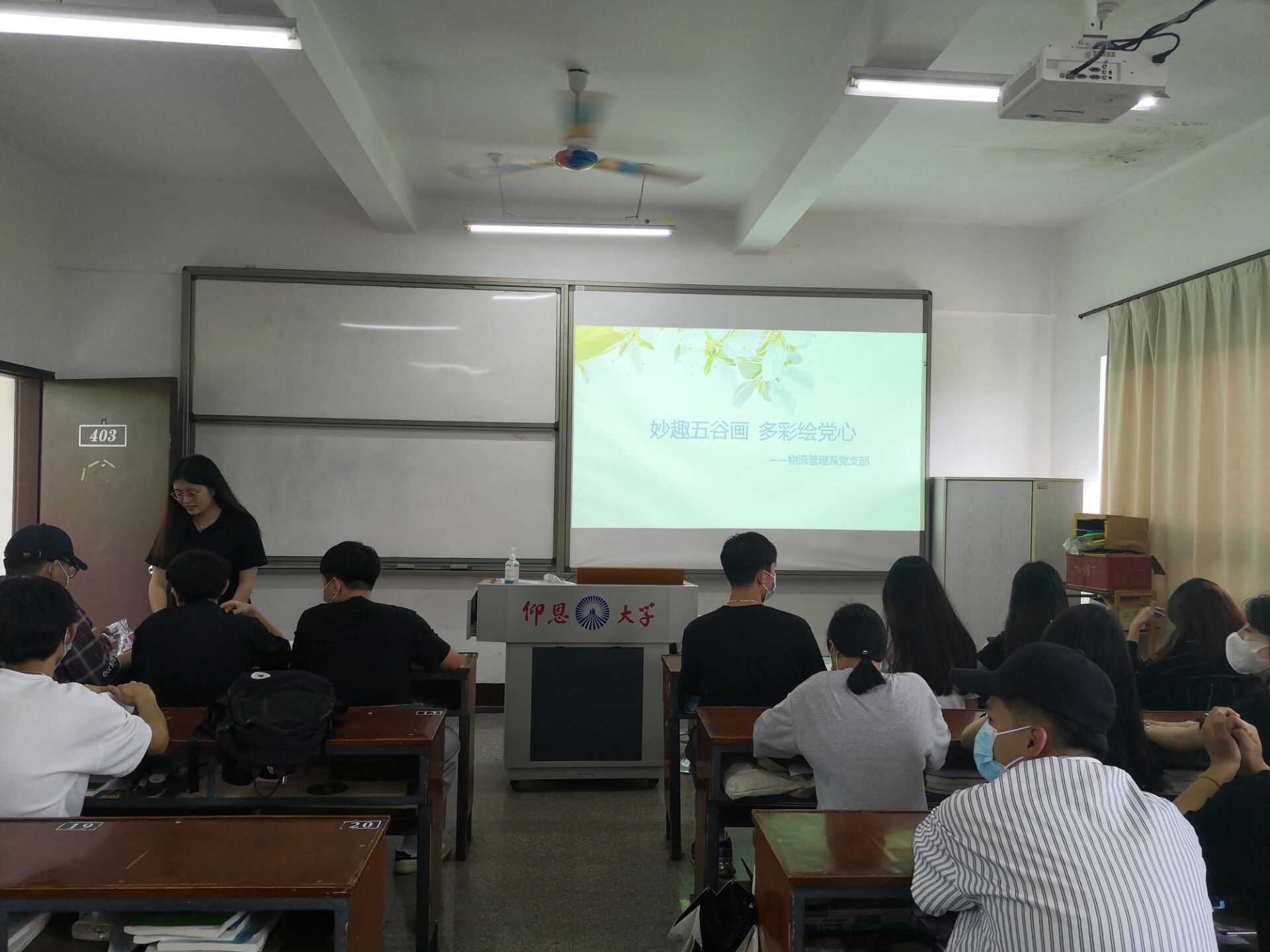 为增强党支部的凝聚力,并丰富支部成员的文化生活。5月25日下午,物流管理系学生党支部在共和楼403教室开展“妙趣五谷画,多彩绘党心”主题党日活动。本次活动由陈莹莹同志主持,支部成员参加。