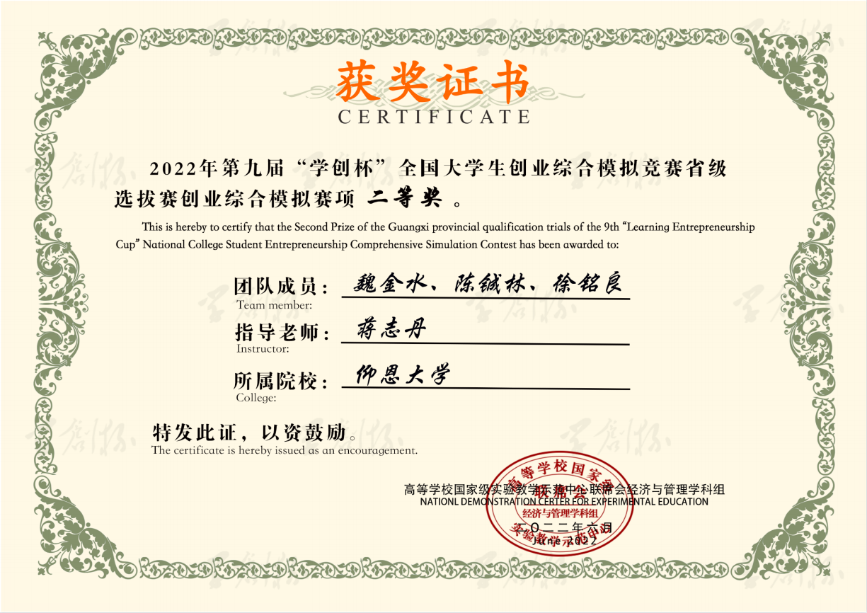 近日,第九届“学创杯”全国大学生创业综合模拟竞赛省级选拔赛创业综合模拟赛项结果揭晓,何杨英、侯玉梅指导的团队(黄翔飞、吴毓莹、叶含露)和蒋志丹指导的团队(魏金水、陈铖林、徐铭良)荣获二等奖。