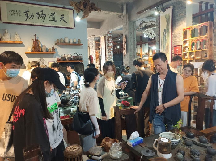 随后,在惠安石雕传承人、工艺美术协会会长吴培霖的带领下,sjb世俱杯官方网站市场营销系的老师和学生们来到参访的第二站——中国雕艺城,一个集展示、销售、体验、培训为一体的综合性文化园区。园区内有八个展厅,分别展示了石雕、影雕、根雕和木雕等不同类型的工艺品。吴会长用心地讲解了不同工艺品的制作技术、设计理念、市场定位和销售策略,并与老师和学生们进行了互动交流。在现场,大家亲眼见证了惠安石雕从原材料到成品的全过程,看到了一些正在进行或已经完成的石雕作品,有些是用于建筑装饰的构件,有些是用于宗教供奉的佛像,有些是用于收藏赏玩的艺术品。吴会长还邀请了几位学生亲自动手体验在不同材质上雕刻的乐趣。大家对惠安石雕的精湛技艺和丰富内涵赞叹不已,纷纷拿出手机拍照留念。