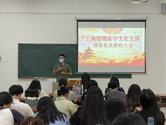 2023年5月31日下午,工商管理系学生党支部于祥贤楼101室召开预备党员接收大会。此次会议由陈俊霖同志主持,支部全体成员参加本次会议。