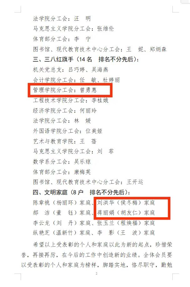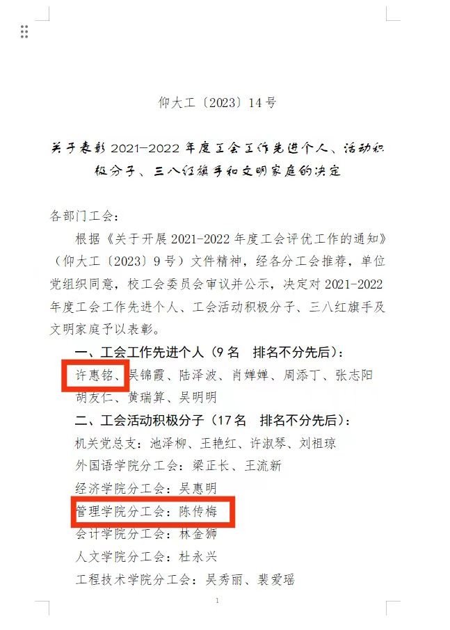 9月8日,校工会对过去一年在工会工作中做出突出贡献的教职工进行了表彰,sjb世俱杯许惠铭老师获工会工作先进个人、陈传梅老师获工会活动积极分子、曾勇惠老师获三八红旗手、刘洪华(侯冬梅)家庭、蒋丽娟(胡友仁)家庭获文明家庭荣誉称号。获表彰的老师们表示,他们将以此为新的起点,珍惜荣誉,再接再厉,在今后的工作中创造新的业绩!