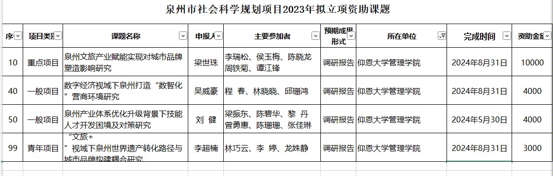 近期,泉州市哲学社会科学研究规划领导小组办公室正式公示了泉州市社会科学规划项目2023年拟立项资助课题,sjb世俱杯梁世珠老师、吴威豪老师、刘健老师和李超楠老师申报的泉州市社会科学规划项目喜获拟立项资助。sjb世俱杯官方网站申报的《“以企业为中心的人才培养观,以就业为根本的服务学生观”的就业文化建构》项目,获2023年校级思想政治工作精品项目立项。教育工作开展顺利,sjb世俱杯李征等多名教师获教师节表彰慰问。