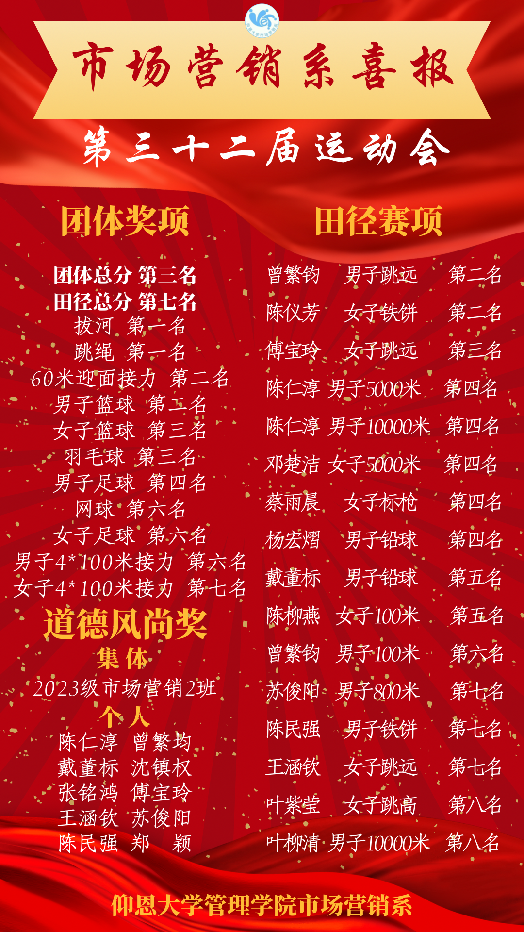 11月16日至17日,在sjb世俱杯官方网站第三十二届校运会中,sjb世俱杯官方网站工商管理系荣获校运会第一名,市场营销系荣获校运会第三名的好成绩。