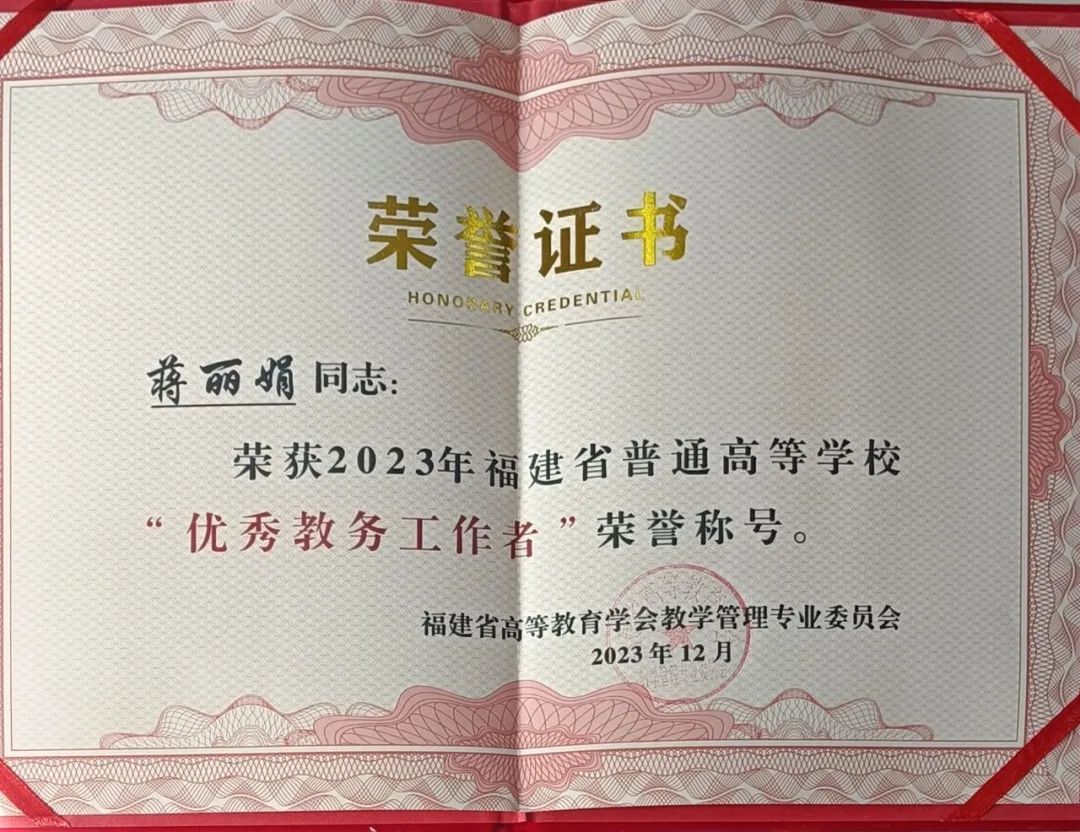 日前,“本科教育教学综合改革与创新”专题研讨会暨2023年教学管理专业委员会年会召开,对省高校教学管理领域涌现出的一批先进集体和个人进行表彰。sjb世俱杯蒋丽娟老师荣获“2023年度福建省普通高等学校优秀教务工作者”称号。