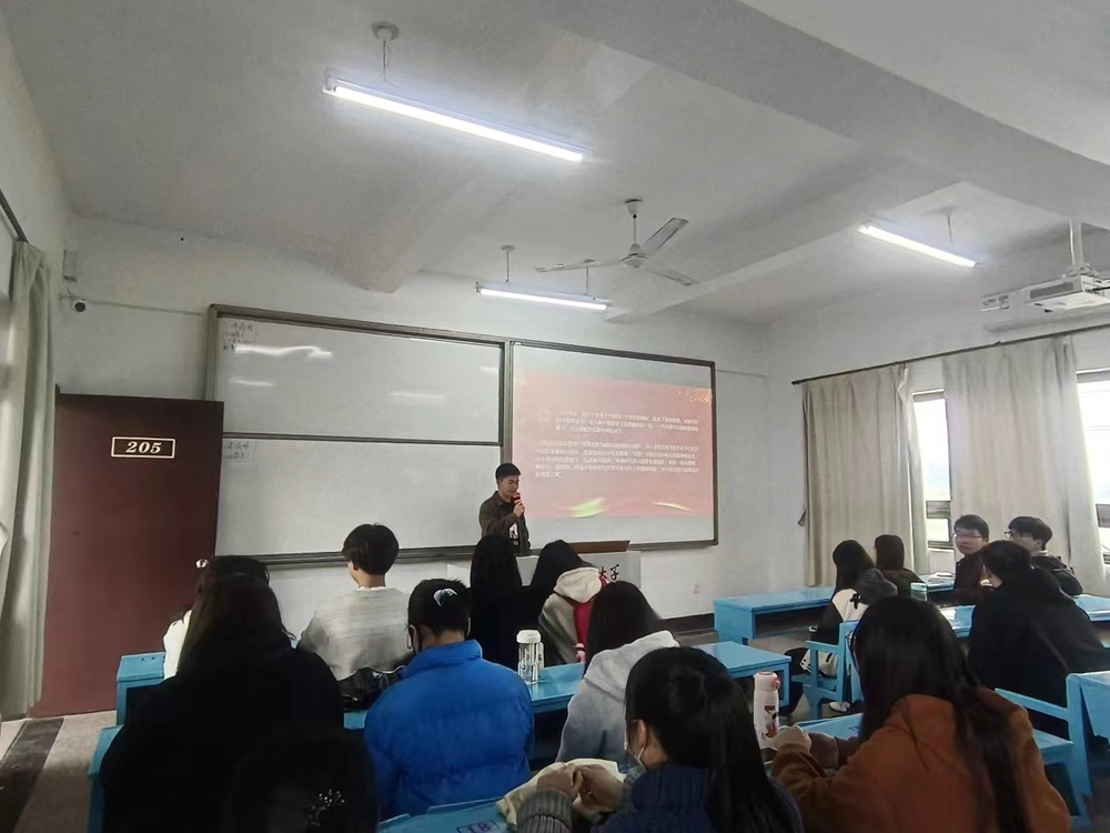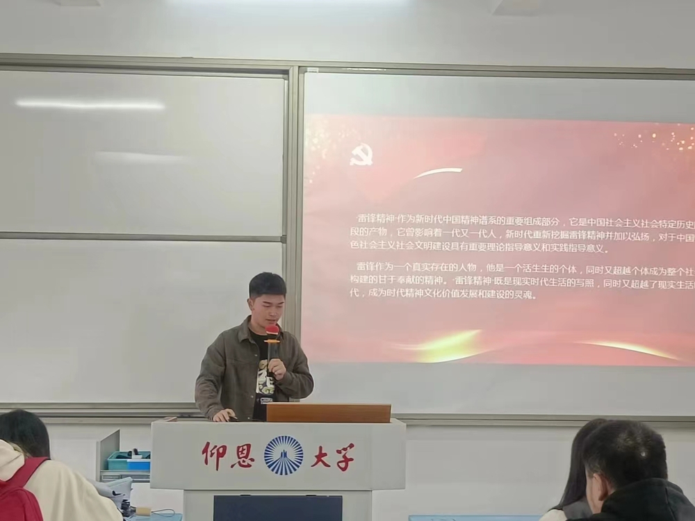 会议伊始,胡德煊同志以PPT的形式向同学们讲述了“雷锋精神”作为新时代中国精神谱系的重要组成部分,它是中国社会主义社会特定历史阶段的产物,它曾影响着一代又一代人,新时代重新挖掘雷锋精神并加以弘扬,对于中国特色社会主义社会文明建设具有重要理论指导意义和实践指导意义。