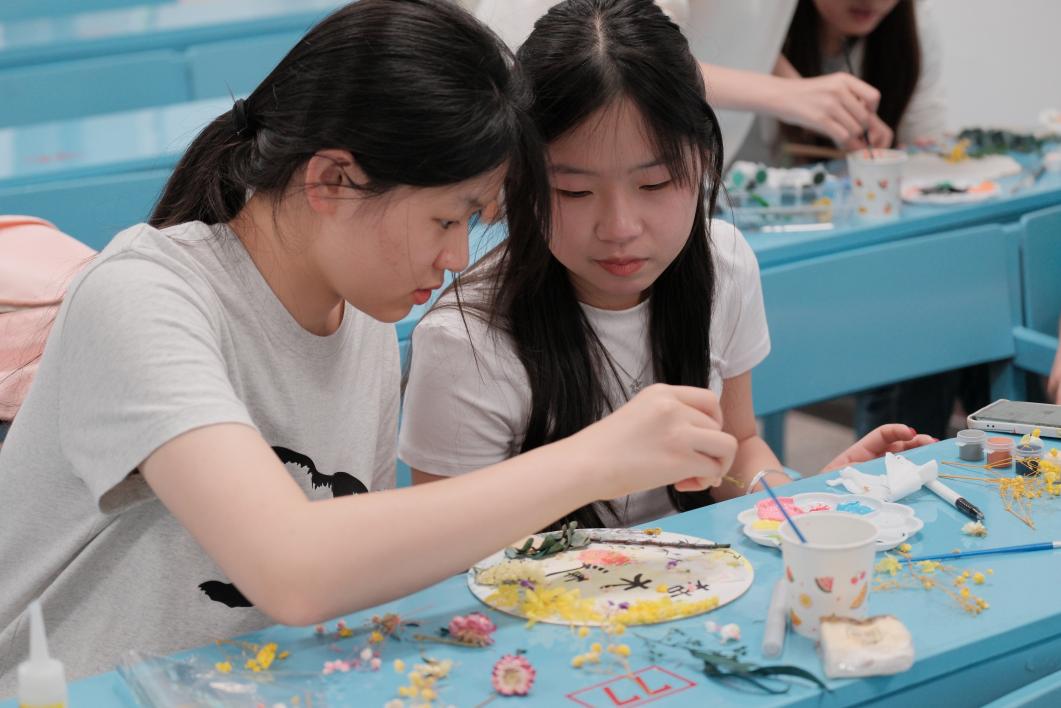 活动现场,在工作人员的指引下,同学们领取团扇、颜料、干花、胶水等制作材料,经过巧妙构思与劳动实践,展现出不同的审美与内心世界。制作过程中,同学们在扇面上进行书法、绘画创作,从构图到笔墨运用,大家有条不紊的创作自己的作品,将自己心中所想、所系通过扇面生动展现,在大家的巧手之下,制作出了一把把或清新淡雅、或浓墨重彩的团扇,既展现了传统文化的韵味,又融入了现代审美的元素。
