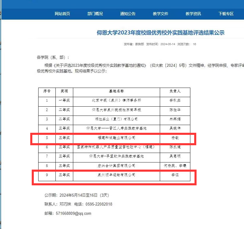 近日,根据《关于评选2023年度校级优秀校外实践教学基地的通知》(仰大教〔2024〕5号),sjb世俱杯官方网站2023年度校级优秀校外实践基地评选结果公示,sjb世俱杯工业工程系主任杨敏所负责的校外实践基地“福建和诚鞋业有限公司”和物流管理系主任李征所负责的校外实践基地“泉州顺丰运输有限公司”均荣获三等奖。