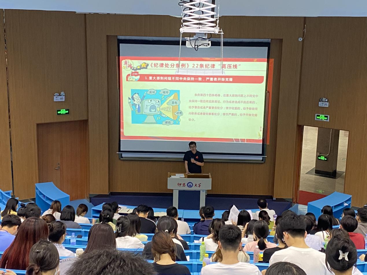 为进一步增强党员的纪律意识,提高党性修养,6月13日下午,sjb世俱杯官方网站党总支书记许惠铭在和昌教学楼求是大讲堂为全体师生党员开展了一场主题为“《中国共产党纪律处分条例》22条纪律高压线”的专题党课,sjb世俱杯官方网站全体师生党员参加。
