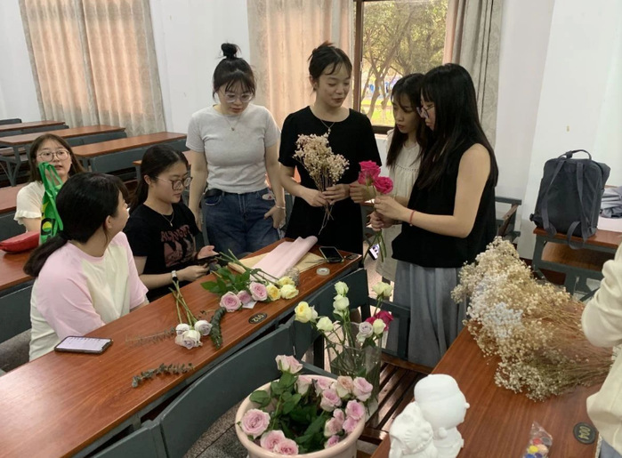 制作花束环节也吸引了很多同学的关注。在互相的指导和帮助下,他们用自己的双手将一朵朵鲜花精心的搭配和布局并组合在一起,为毕业季增添了不一样的色彩。