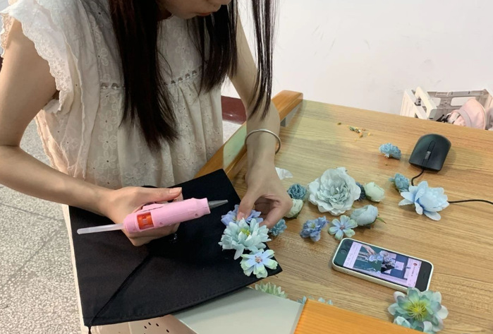 在装饰学士帽的区域,同学们通过使用花朵、贴纸等材料精心制作出一款款独居风格的学士帽,创意又浪漫。这些学士帽不仅具有很高的观赏价值,更寓意着同学们对未来美好生活的向往与憧憬,希望它能如花朵般绽放,热烈、幸福。