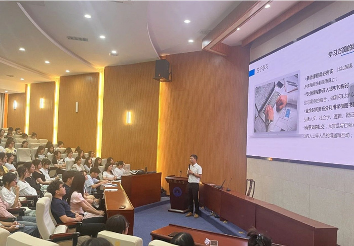 陈绍炯老师作为此次的主讲人,分享了他给2024级物流管理新生的寄语:向上,向善。第一个是“向上”,抬头。争取自己想要的东西,要踮起脚尖,要抬起头去看,去够,争取我们想要的东西。第二个是“向善”,这是从校训“学会做人”,“学会做事”两个方面来谈的。希望物流新生们在学校学习的过程当中,能够去关心身边的同学、老师。
