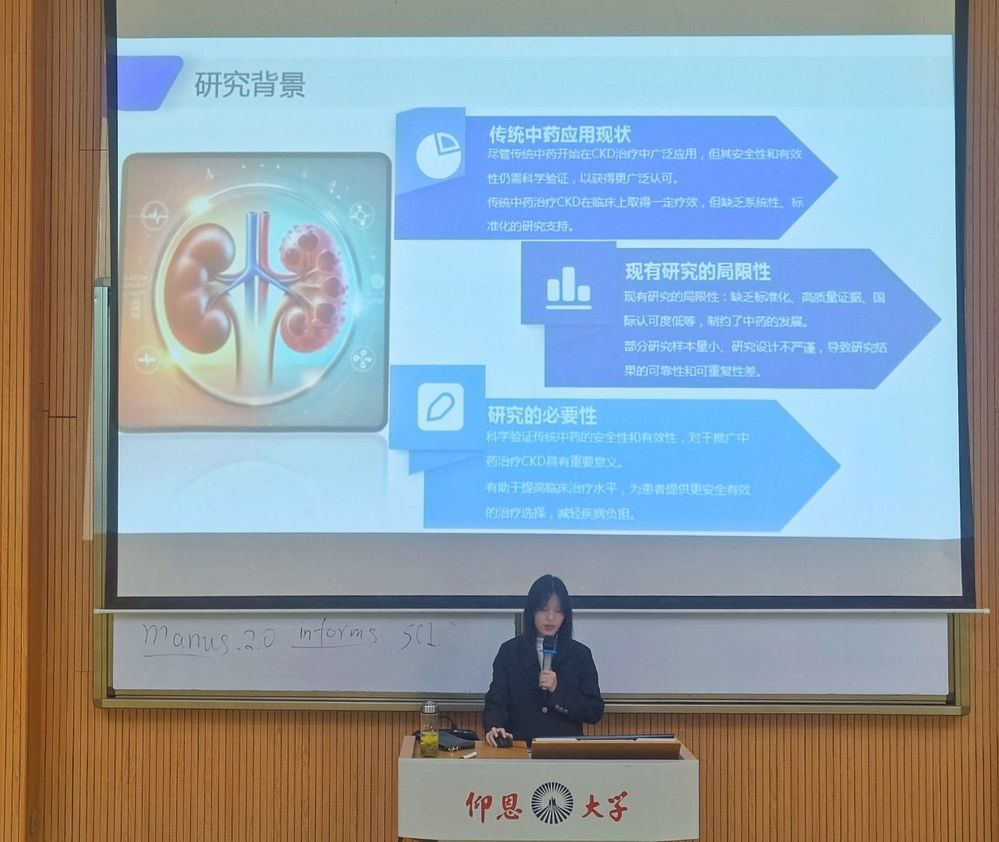 分享会上,侯玉梅教授以“Deepseek助力大学生学习及科研素养提升”为主题,向同学们介绍Deepseek在科研中的应用,为大家开拓了新的科研视野。而后由2023级工业工程2班的肖美晨同学分享自己关于“传统中药治疗慢性肾脏病(CKD)的安全性和有效性研究——基于大数据分析”的科研成果,为同学们提供了宝贵的科研实践经验。互动环节中,同学们踊跃提问,与主讲人进行深入的交流。最后,侯玉梅教授对本次分享会进行总结发言,鼓励同学们积极运用科技手段提升自身的科研能力。