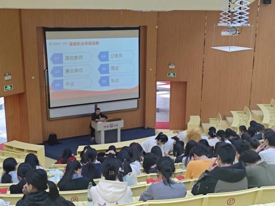 讲座开场,泉州华图讲师从当前就业环境入手,引导同学们结合自身兴趣与专业优势,理性看待考公、考编。讲师分享的福建职业幸福指数显示,公务员职业名列前茅,这一话题引发了同学们的浓厚兴趣,现场互动热烈,同学们对职业定位有了更清晰的认知。