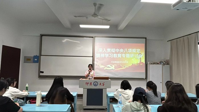 4月9日,市场营销系学生党支部于共和楼206开展深入贯彻中央八项规定精神专题学习研讨会。