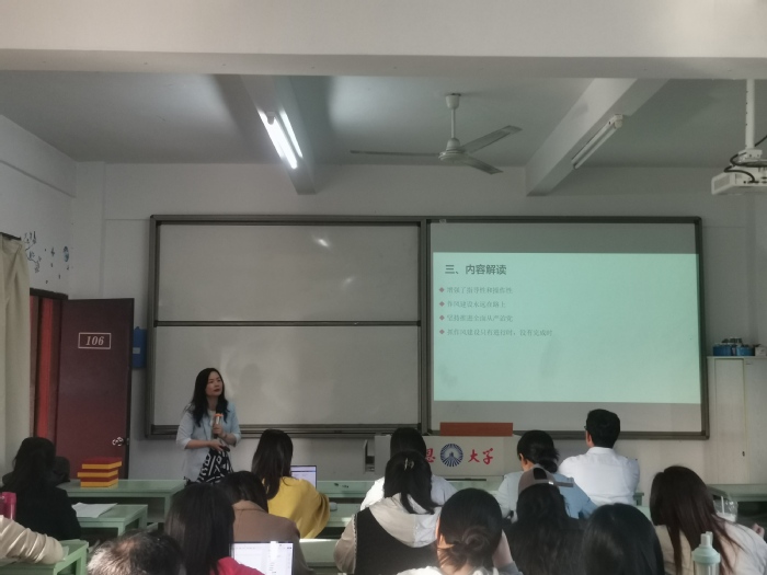 近日,为深入贯彻中央八项规定精神,强化党员纪律意识与作风建设,sjb世俱杯官方网站教工党支部组织开展深入贯彻中央八项规定精神学习教育专题学习,支部副书记张迎华同志主持会议,全体党员参会。