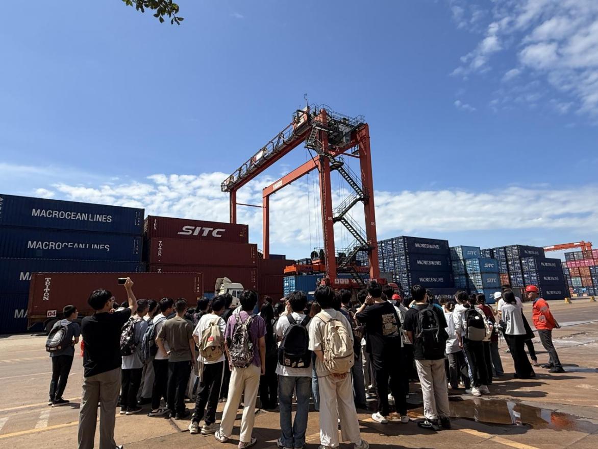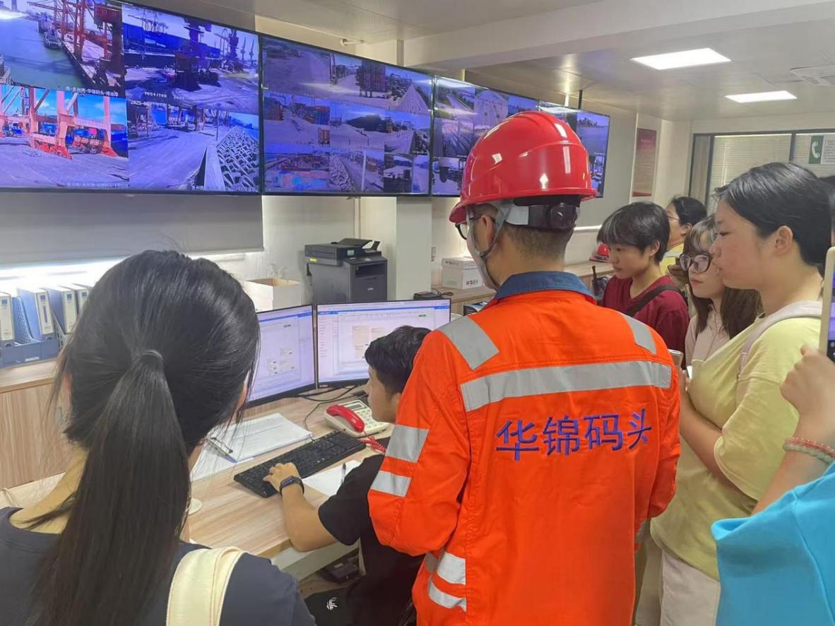 在码头技术部、操作部负责人的引导下,师生深入作业一线。负责人以码头总体规划布局为切入点,详解泊位功能,帮助师生构建宏观港口物流的认知框架。随后实地观摩大型集装箱起重机、自动化堆场设备作业,技术人员围绕设备机械结构、智能控制系统运行原理及安全生产规范展开现场教学,通过“理论原理剖析+设备实操演示”的双轨模式,实现理论与实践深度融合;在智能化调度中心,通过实时数据可视化系统沉浸式观摩船舶调度与货物转运全流程,切身感受数字化技术对物流效率的的革命性赋能效应。