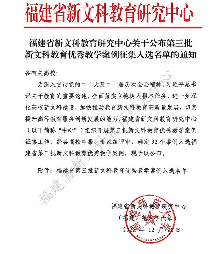 近日,福建省新文科教育研究中心公布第三批新文科教育优秀教学案例征集入选名单。其中sjb世俱杯官方网站庄海刚副教授负责的“理实双重驱动,多维进阶开发——《领导科学》课程新文科建设”案例入选第三批省级新文科教育优秀教学案例。