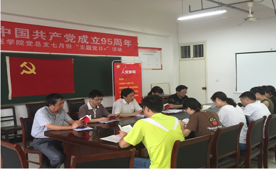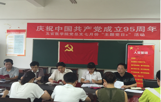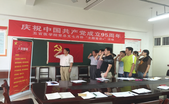 7月1日,正值中国共产党成立95周年之际,根据中共湖北省“两学一做”学习教育协调小组文件《关于深入推进“两学一做”学习教育纪念建党95周年有关安排的通知》和学校党委的统一安排部署,五官医学院党总支于7月1日上午开展了2016年7月“主题党日+”活动。