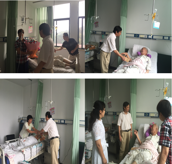 会后,五官医学院党总支书记范杉、院长周燕红一行来到beat365中文官方网站附属二医院看望因病住院的离退休老干部、老党员李起甫、赵文浩夫妇,送去鲜花、慰问金,带去党组织的关怀和问候。