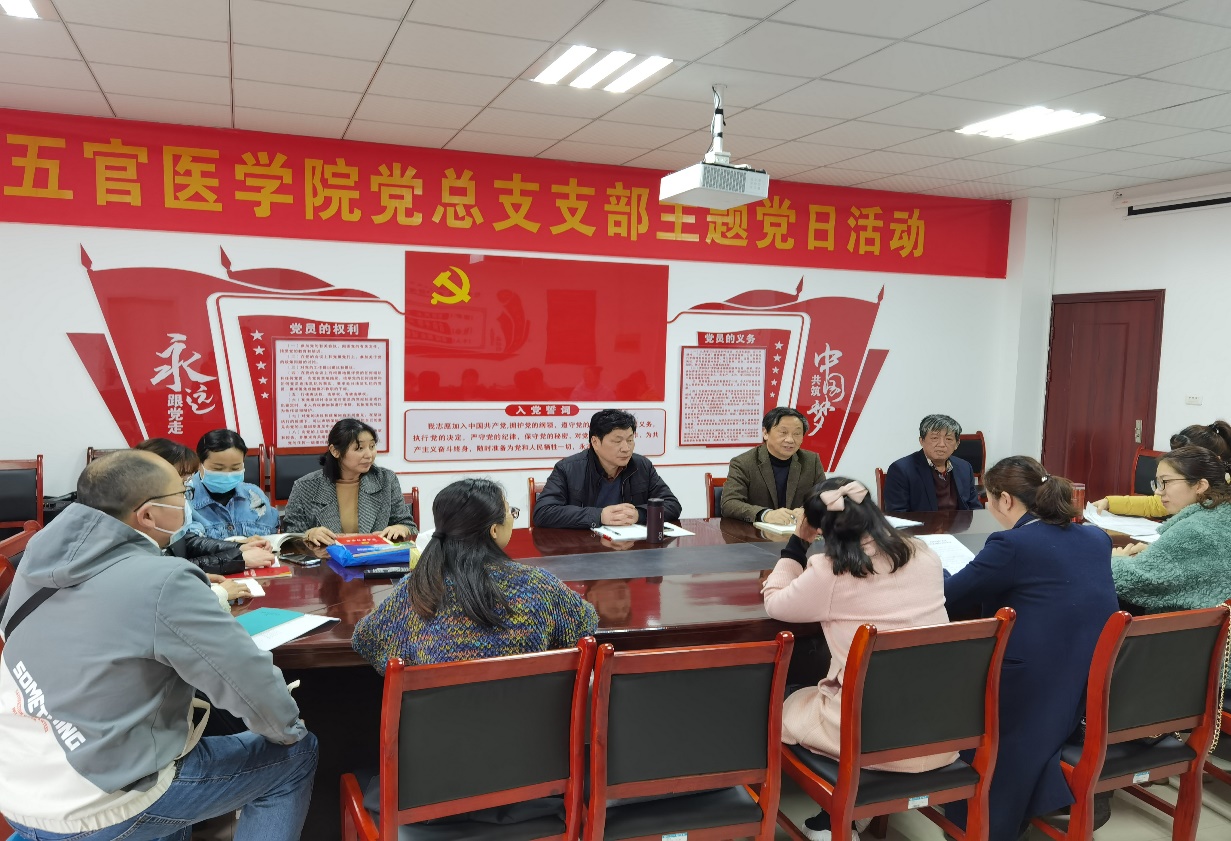 2021年3月16日下午4点半,五官医学院教工党支部在五官医学院5楼会议室开展2021年3月支部主题党日活动,本次活动主题为“学党史、悟思想、办实事、开新局”。五官医学院党总支书记范杉、五官医学院院长沈定文同志及支部全体党员参加。